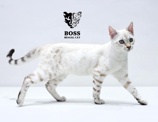 Rings joined us in June from Boss Bengal Cat in China. She is a seal silver spotted lynx (tabby) point. Rings has nice nose leather, amazing whisker pads, and chin. She has an amazing long, lean body and a nice medium thick tail that is blunted at the end. Rings has a wonderful pattern with horizontal flow with spots all the way down her legs. She is very affectionate and loving. Rings enjoys getting kisses on her nose and head.
